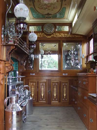 The interior of a waggon - In larger wooden waggons of special importance was a cast iron stove, usually a hostess type, for both cooking and heating. In lighter Bowtops