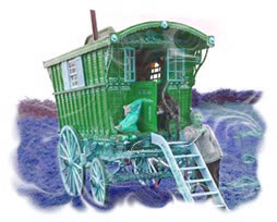 Contemporary Bowtop on "easy clean" wheels. Can be horse-drawn or motor-towed. Stained glass windows and exterior hand-painted floral decorations. Inside has sleeping area for two plus seating area-cum-single bed. Gas oven/hob and grill, multi-fuel stove, and Ladlow antique tiles around the basin. Picture courtesy of Ian. |