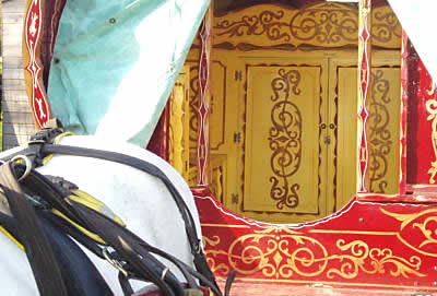 Patterned satins, silks, velvets and lace, personalised with meandering coloured enamel n gilt curliques, fruit and floral designs, Gypsy cob and bird motifs, over-stained wood or scrumble finish. There's even the odd carving too.