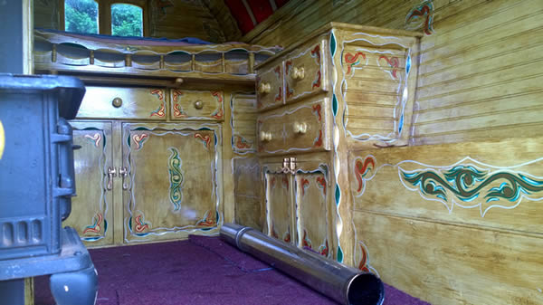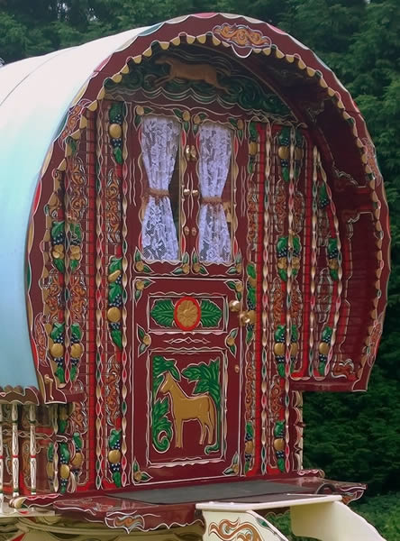 Romany vardo builder William Wright of Leeds, Yorkshire. With colourful waggon artwork executed by artist Pete Delaney.