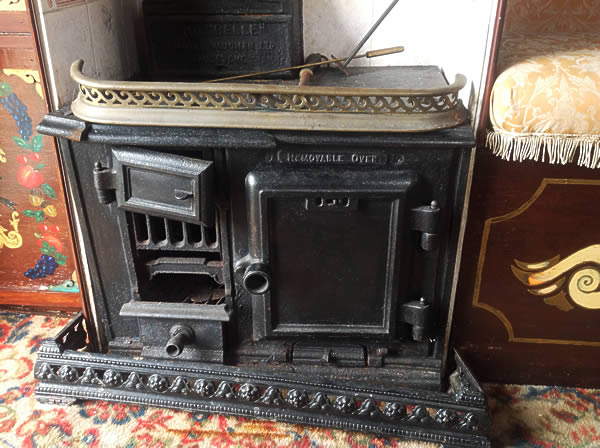 romantic feel. Has a stove but could do with replacing. Iron shod wheels roll nicely. Complete with brake. Mirrors and cupboards, pretty paintings, cratch and steps, windows both sides and rear, all open. Lamp brackets.