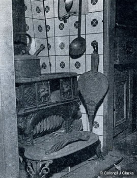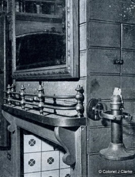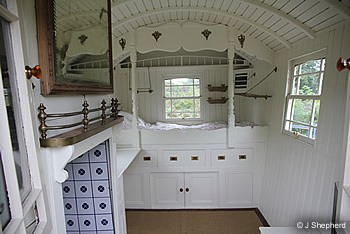 The interior was painted pale green with blue fine-lining, although later on it was repainted in shades of white. Light reflected from nine mirrors, some with chip-cut edges. For convenience a table folded down into a desk, and a brass-railed mantelpiece topped a Smith & Wellstood Queenie stove. Gilded handles and fleur-de-lis added a flick of glamour to cupboards and drawers.