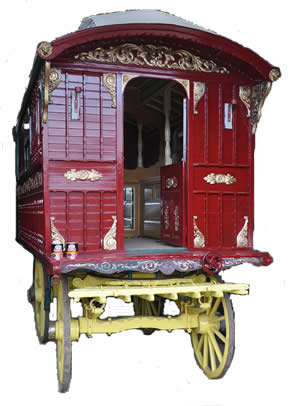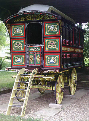 'BURTON WAGON circa 1890 to suit 15 to 16 hh single or pair; painted green with coloured decorations, the undercarriage has been repainted and fitted with a kettle box. The interior has been decorated and fitted with an oven stove, and comes with steps, shafts and pole.'