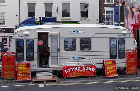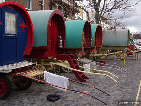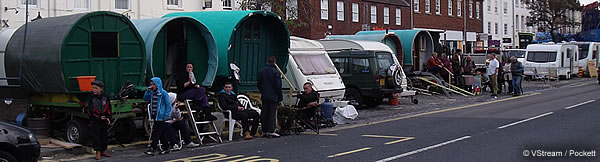 One end of the street has travellers with bowtop waggons and a few trailers.