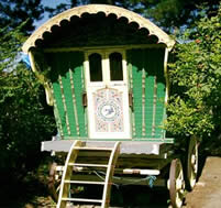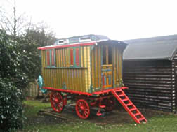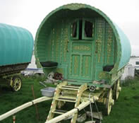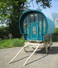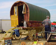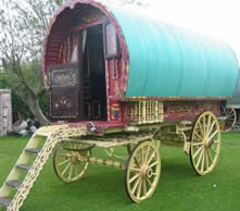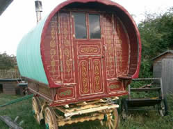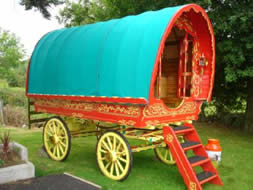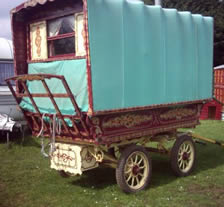 Openlot Bowtop Dating from the 1950's. The axles have the builder's stamp Watts & Sons, Pershore and Worcester. This vardo travelled around Wexford in Ireland in the 1950s and 60s and is still in use for holidays. Restored with new canvas, paintwork and mahogany steps. Has a pull-out double bed, cupboards, drawers, and panbox at the rear. The wheels are newly built on the original axles and made from oak, ash and birch. On rubber tyres. Travels the drom with a lovely piebald. Pictures courtesy of Kieranna. |