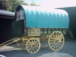 Bowtop In beautiful blue. An unusual coloured waggon, nicely decorated on traditional spoked wheels. |