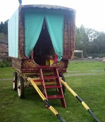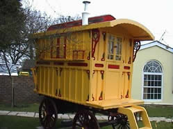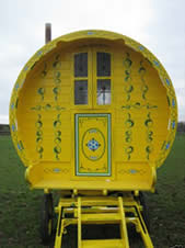 Contemporary Vardo Cheerfully finished in yellow and red, on wooden spoke wheels. Picture courtesy of Unkn. |