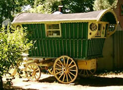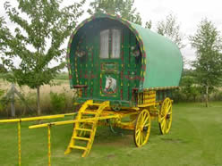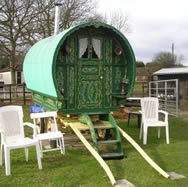 Bowtop Window and door style, on original base with new top built 2 years ago. Working Queenie stove, shafts, pan box, carriage lamps, pneumatic tyres on artillery wheels, and well curved steps. Finished in green and cream, and very well decorated. Picture courtesy of Elaine. |