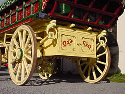 Openlot Bowtop "Orangimoon" Bill Wright-style openlot. Completely rebuilt top on restored original unders from an early Wright's bowtop. The axles are stamped 1890. There are spindle boxes or racks on the body and an unusual oakleaf carving with original boars teeth on the rear. Decoration includes Celtic scroll-work to the front lower panel. This waggon required the old artwork being removed and then complete redecoration. Nice bowtop. Pictures courtesy of Kevin. |