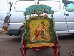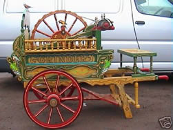 1950s Grinders Barrow Not a vardo, but we thought this little painted barrow was so special that we put it in the gallery. 1950s grinders barrow, fully restored and owned by Gypsy Bert (Smith). He used to sit peddling away, wearing his bowler hat and waistcoat, sharpening tools and knives, etc. |