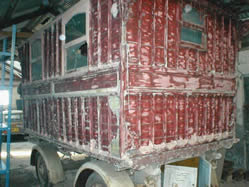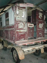 An Early Tong of Bolton Showman's Waggon Awaiting restoration, with some nice early carvings on the front panels and porch brackets. Pictures courtesy of Unkn. |