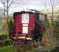 Bowtop Lovely maroon body with cream scroll decor on rubber-tyred spoked wheels. Very tidy vardo. Pictures courtesy of Unkn. |