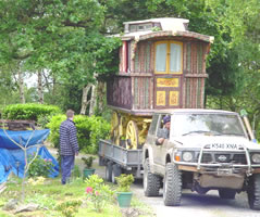 Large 4x4 Vardo New build vardo, made in 2005 by Jon Snow at his workshop with Robert Howell. Built on a Tabbert chassis, this rubber-tyred steel trailer was designed to be pulled by a van or large car. Traditionally decorated by Sarah Farr, it was sold on to a family in Hertfordshire who use it for woodland skills courses. Ideal continental travel wagon. Picture courtesy of Jon Snow, Windy Smithy Workshops To see more of Jon's wagons visit www.windysmithy.co.uk/html/wagons.htm |
