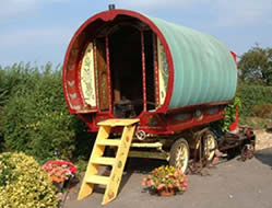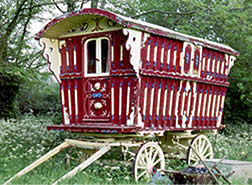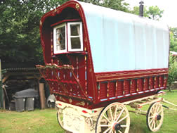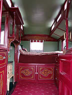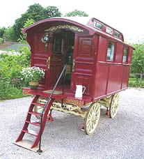 Square-bow Gypsy caravan - a rare and fine example, totally restored. Has shafts, queenie stove and steps. Finished in burgundy with cream unders, prancing horse on the door, and bay window to the rear. Pictures courtesy of Hugh, Gypsy Caravans UK. |