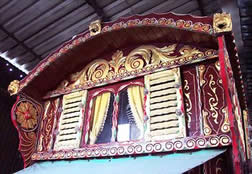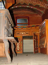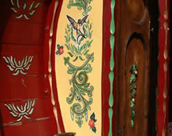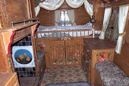 Orton "Reading" Vardo - Paultons Park This is one of - if not the finest - reading waggons in existence today. It dates from around the 1900s. The interior is unique. Features include fabulous ceiling artwork of Roman chariot scenes and cranberry angel lamps. Other features are the many carvings of animal heads. Full colour pictorial on the feature pages! Pictures courtesy of Paultons Park and John Pockett. |