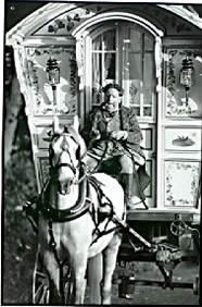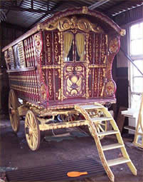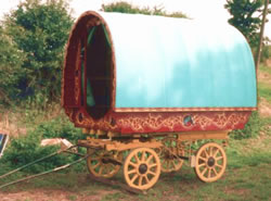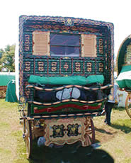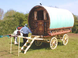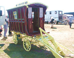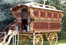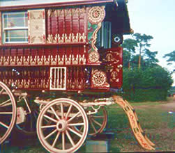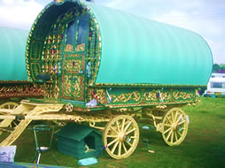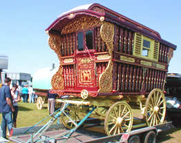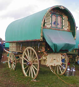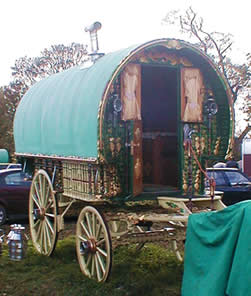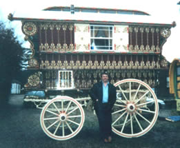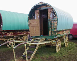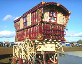Bill Wright Style Bowtop A stunning copycat example of a classic design innovated by Bill Wright, the renowned Yorkshire maker. This vardo was actually built by another maker in Halifax. Once owned by a Yorkshire traveller family, it went up to Scotland and spent some time in a museum. In private hands again, this waggon is now permanently lived in by its present owner. Very ornate and fully decorated in the traditional methods. Here it can be seen at Stow Fair. Pictures courtesy of Ken Mayhew. |