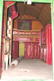 Reading Style Waggon Crimson lake with cream unders, this waggon is a craftmaster's dream. Extensively carved throughout. Fabulous floral designs, including floral-carved sills and weather boarding, with golden gargoyles staring at you. Butterfly chamfered ribs in red, green and gold, Dunton-carved butts all round, inter-ribbed acanthus carvings to most corners, wood stained windows with cream shutters, S-ladders and rear cratch. Someone's proud waggon! Some work has gone into this lovely vardo. Pictures courtesy of Ken Mayhew. |