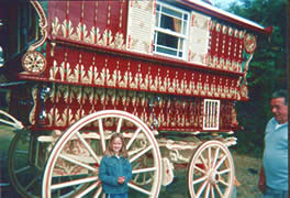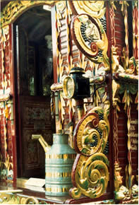 Classic Reading Style Waggon Fairytale and romantic! - the "lantern top" image of a Gypsy waggon. A style that inspired many writers and poets, such as in Kenneth Graham's "Wind in the Willows". This a fine and quaint example. Finished in crimson lake with cream unders. Carriage lamps, acanthus leaf porch brackets, stretched horse carving to the crown board, front and side weather boards adorned with lions heads and rope design goldleaf artwork. Butterfly chamfers in red green and gold, also to the waist board, and note the wood-stained windows. Sheer nostalgia! Pictures courtesy of Ken Mayhew. |