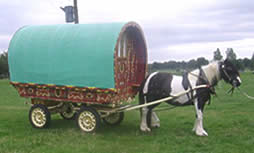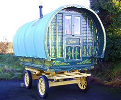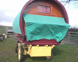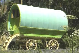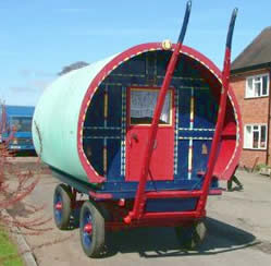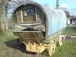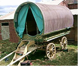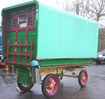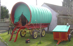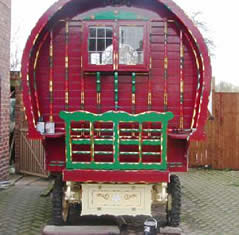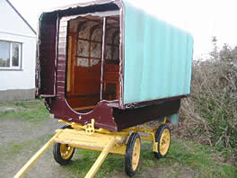 Wainfleet Square-bow Believed to have been built around 1940's in Lincolnshire and known as a Wainfleet Living Waggon. This lovely squarebow was used throughout 2006 and was seen regularly around the Lincoln area. Its green body sits proudly on red artillery wheels with pneumatic tyres and it was fitted with a new canvas early 2006. But lets not forget to mention the hanging clanging brasses and pots in the bedroom. A simple waggon with a taste of real traveller themes about it. Internal height 6ft, width 5ft 8", length 11ft. Pictures special thanks to Doug and family. |