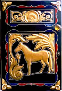 Bowtop A Stunning bowtop waggon, one of a few in scotland - window and door style. Built and decorated by Alan Jamieson 5 years ago its simply quality craftmanship throughout , the traditional unders are based on a Bill Wrights potcart he once owned and the decoration is equally breathtaking especially when you see it close up. Alan (once a signwriter) definately made his mark decorating this vardo - body in Crimson lake , delicate inter ribbed scrolls weaving up the front and rear panels in cream n greens, chamfers in goldleaf, cherry and greens. Cherry red scroll work on the door - dashed with whispers of white surrounding the prancing goldleafed horse. The spindle cages speak back in cream with bands of red to match the swan neck steps and equally enchanted unders. Some Vardo! Pictures special thanks to Alan |
