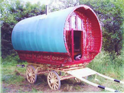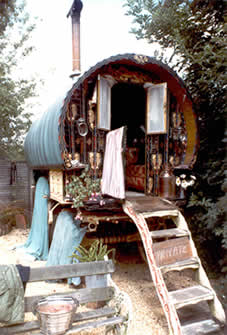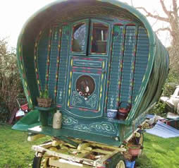 Showman's Waggon Surrounded in unison by a bright colourful blue bed of "forget me nots" this cheerful looking little showman is far from forgotten - for Clare keeps her vardo well oiled and glossed up against the Cornish sea breeze of the summer months on her beach car park field. Imagine the "forget me nots" carrying on "painted" up the side of the waggon, if you coloured the waggon green you'd never know it was there! Be a job though trying to find the waggon in the dead of night, especially after a few jars of local potent scrumpy! But then youv'e got the bushes to sleep in. Picture courtesy of Trevor n Jackie and appreciation to Clare! |