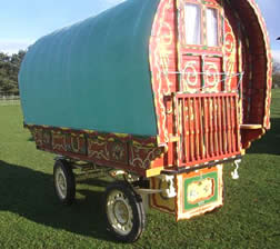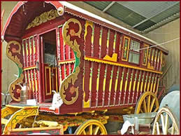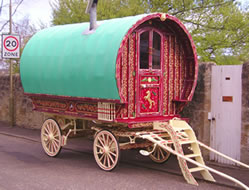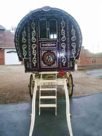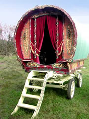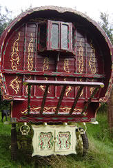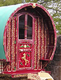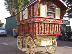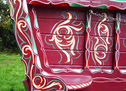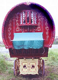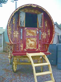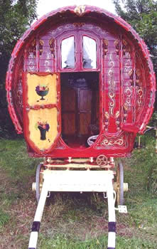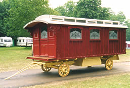 Bowtop A Quality traditional built waggon - window n Door type , finished in a rich crimson red and cream unders This lovely classic vardo shows off some stunning decoration , tastefully balanced with light floral scrolls and curlicues to each panel, its got excellent inter-ribbed carvings finished in gold making the front of this waggon stand out above most! Lovely example of UK Vardo.!