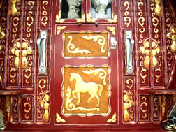 Bowtop This waggon is truely a little gem - an outstanding example. Crimson lake body with cream unders, and the art decoration is beautiful and balanced, two tones of red make this waggon cherry & fruitful to the eyes. Excellent scroll work throughout, inter ribbed carvings give it some subtle and physical depth. All the waggon is nicely lined out . Its has a great shaped rounded bay window , twin colt heads on the kettle box, and bowls of fruit on the inner front doors panels.