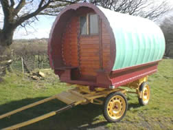 1924 Wood Brothers Bowtop Bowtop build by Wood Bros of Wingate about 1924 on existing dray and restored in 2006. Now a holiday caravan nestling in an acre of riverside meadow. Traditional interior includes a pot-belly stove, double bed, seating and cupboards. Pictures courtesy of Greg of Under the Thatch. |