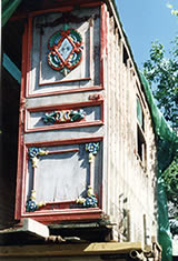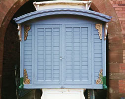 Burton Waggon, c.1910 A well travelled Burton style Showman’s van . The showman-Burton is characterised by its under body wheels rather then the wheels running outside of the body like the reading style vans, This example has nicely carved porch brackets and its original paint work. It has very little carving to the body. Broad waistboard in blue and green. This waggon was acquired by Luton Museums in 1983 in poor condition, having travelled between Luton, Leighton Buzzard and Aylesbury before the Second World War. Picture courtesy of Luton Museums. |