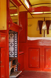 The interior equally embraces a style but one of dare we say " victorian" design - William Morris type fabric and brush grained light wood panels meeting darkwood grained well chamfered framework. The lucky queenie stove is perhaps feeling well and truely at home in this little travellers waggon. A brass trimmed fender squares the hearth off amongst the red carpet and the interior woodwork shows off classic Acanthus scrolls on every panel with flashes of green to break up the reddish tones and its all rustically tied together by subtle light finelines. With a glowing evening sunset shinning in through the tiny panes of the bay window you would I'm sure feel like you were in a cherry and and chocolate heaven. Quaint little waggon if ever there was one.