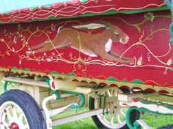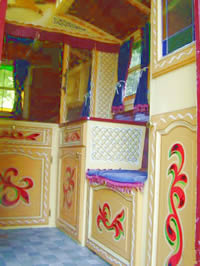 On top of the deep red body colour a beautifully painted gyspy waggon cameo adorns the door, with wild bird pictures standing guard either side. The side panels also carry cameos of Gypsy waggons, whilst a bird swoops in on the back. The stunning artwork was painted by Lawrence, a canal boat painter - and the scrollwork and chamfers were painted by a young lady art student, Jo.