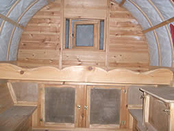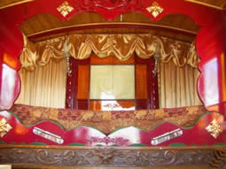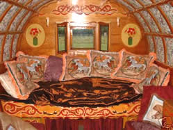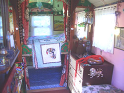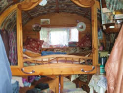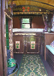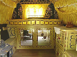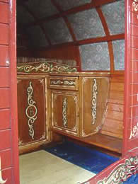The interior has cut glass handles imported from india, poppy red and green stained glass windows and elegant floral patterned ceiling, There's a spindled bed rail and mirrored cupboard doors, pleated primrose silks drape the both sides and window and the queenie stove sits amongst heavy well executed curlicues,