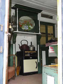 A well preserved interior includes a reproduction Queenie stove, bed, cupboards, decorative mirrors, swivel lamp, etc.