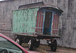 Only the body of this old gypsy waggon remains - placed on a trailer, it's probably been a while since this waggon was rolling the roads. Up until recently it has been used as a garden shed.