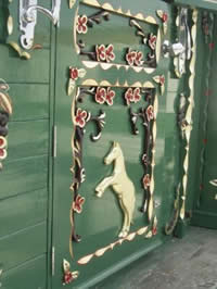 This window and door style Bowtop is standing on a John Willy dray which is 30yr old. Majestically painted in colours of green, gold and cream and decorated with intricate scrollwork and dancing horse motif on the door, horse head motifs intwined with scrollwork adorn the side panels. Beautifully lined.