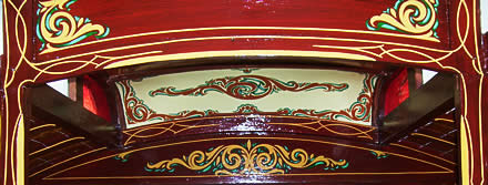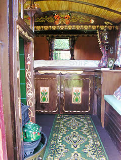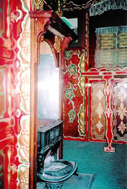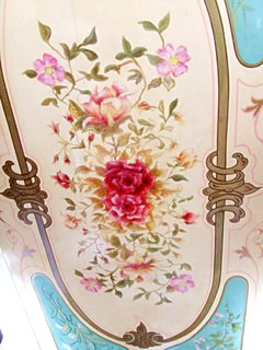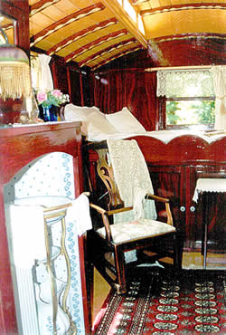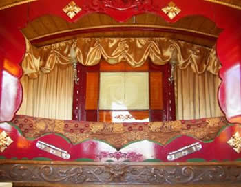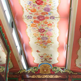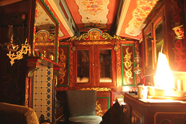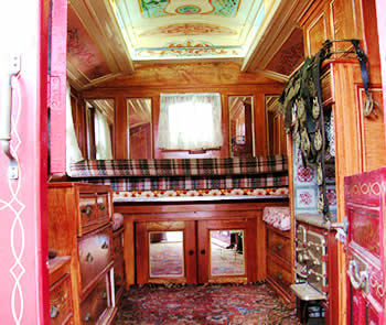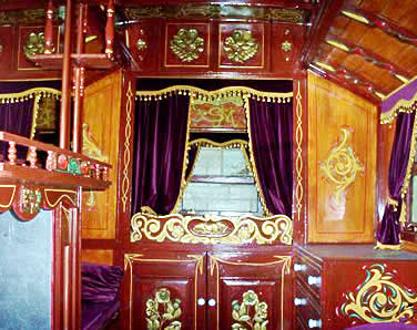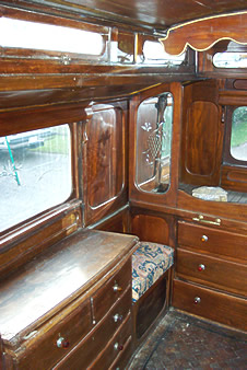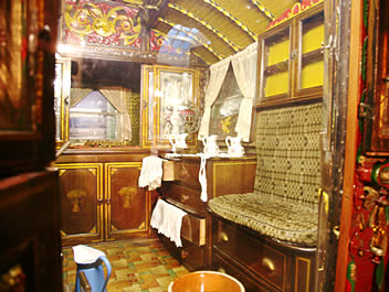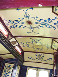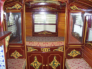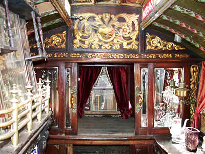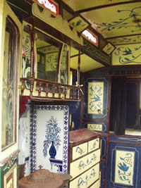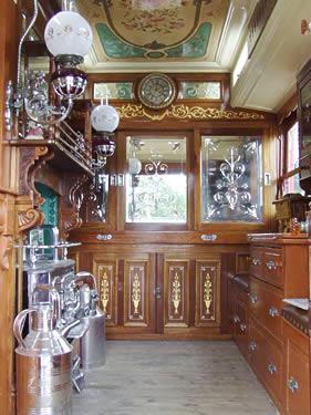 Wooden sided interiors showing different styles - from richly ornate with exquisite stain glass mollicroft windows, epic gold leaf carvings and brilliant cut glass mirrors to intricately painted ceilings, stained wood or scrumble finish with curliques and floral motifs embellishing cupboards, doors space and fireplace.