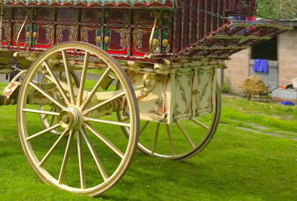 Romany vardo builder William Wright of Leeds, Yorkshire. With colourful waggon artwork executed by artist Pete Delaney.
