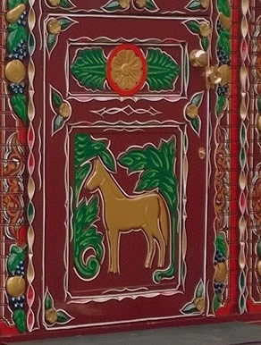 The split front door carries Bill Wright’s iconic horse motif carving along with the