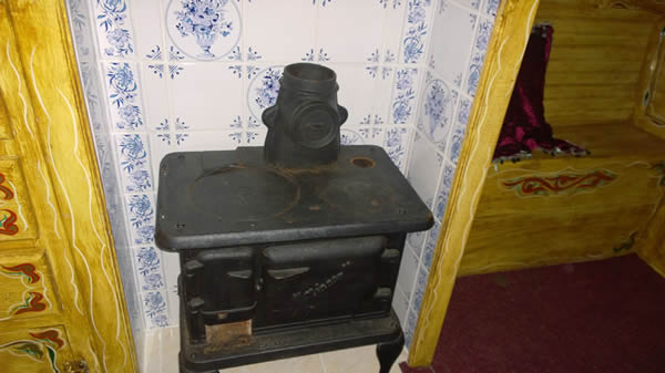 floral tile fireplace harbours a traditional “little nipper” stove with oven. (Stove pipe removed for transport). There’s also a corner cupboard, china cupboard and a