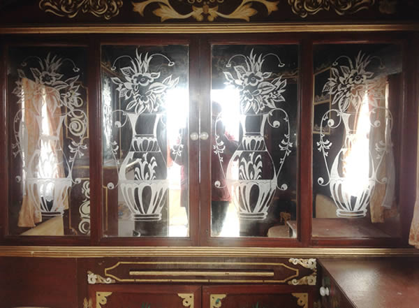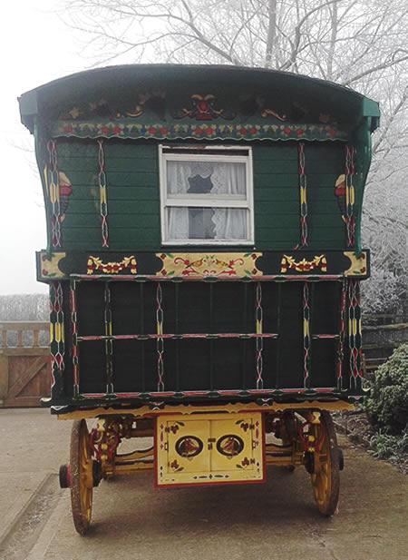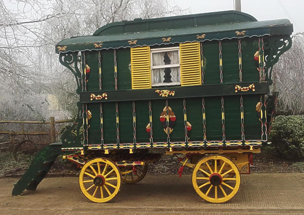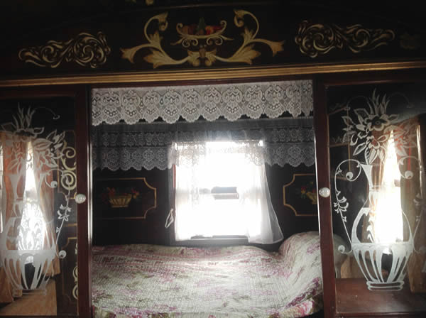 romantic feel. Has a stove but could do with replacing. Iron shod wheels roll nicely. Complete with brake. Mirrors and cupboards, pretty paintings, cratch and steps, windows both sides and rear, all open. Lamp brackets.