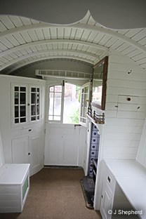 The interior was painted pale green with blue fine-lining, although later on it was repainted in shades of white. Light reflected from nine mirrors, some with chip-cut edges. For convenience a table folded down into a desk, and a brass-railed mantelpiece topped a Smith & Wellstood Queenie stove. Gilded handles and fleur-de-lis added a flick of glamour to cupboards and drawers.