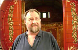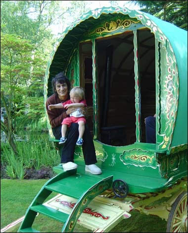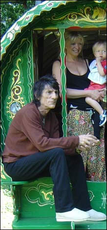 As a heavy metal pheasant rocked n crowed in the early morning sunlight of Ronnie's woodland grounds, little did the "Romany Stone" realise he would be waking up to a different type of riot - one of splendid artistic curlicues and colours in the fiendish shape of a Gypsy bowtop waggon: a 60th birthday present from his beaming wife, Jo Wood.