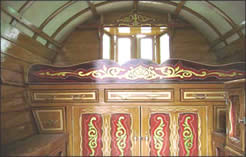 The Romany bowtop waggon, skilfully daubed with ornate artwork, is the finished hand of vardo restorer Nick Dow of the Flyde.