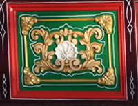 The timber panels front and back replaced with rib and matchboard timberwork. Much of the gilded artwork was badly painted over in a dark green and red. The underworks, including all the artwork, obilerated in cream paint.