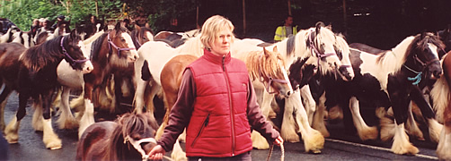 On Saturday it turned out colder and wintry, and in the evening snow was on the hills. I went in to the town and saw the washing of the horses in the river. There were a lot of people and a good atmosphere. I saw an amazing sight: an enormous horsebox which had welshgypsyhorses.com written on the side pulled up a back road. They let the ramps down, and 50 coloured horses came out and were herded into the main street and up on to the hills. It was just like the wild west.