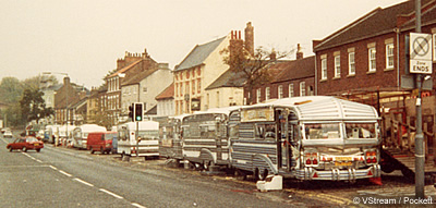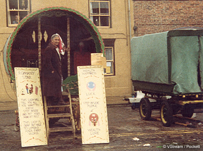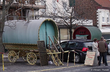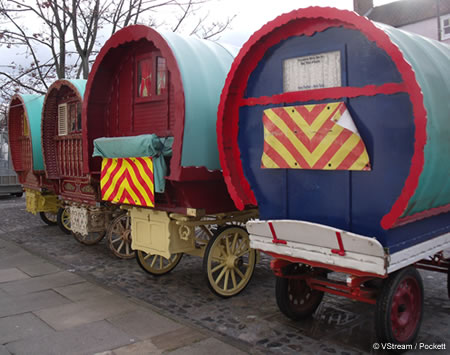 One end of the street has travellers with bowtop waggons and a few trailers.